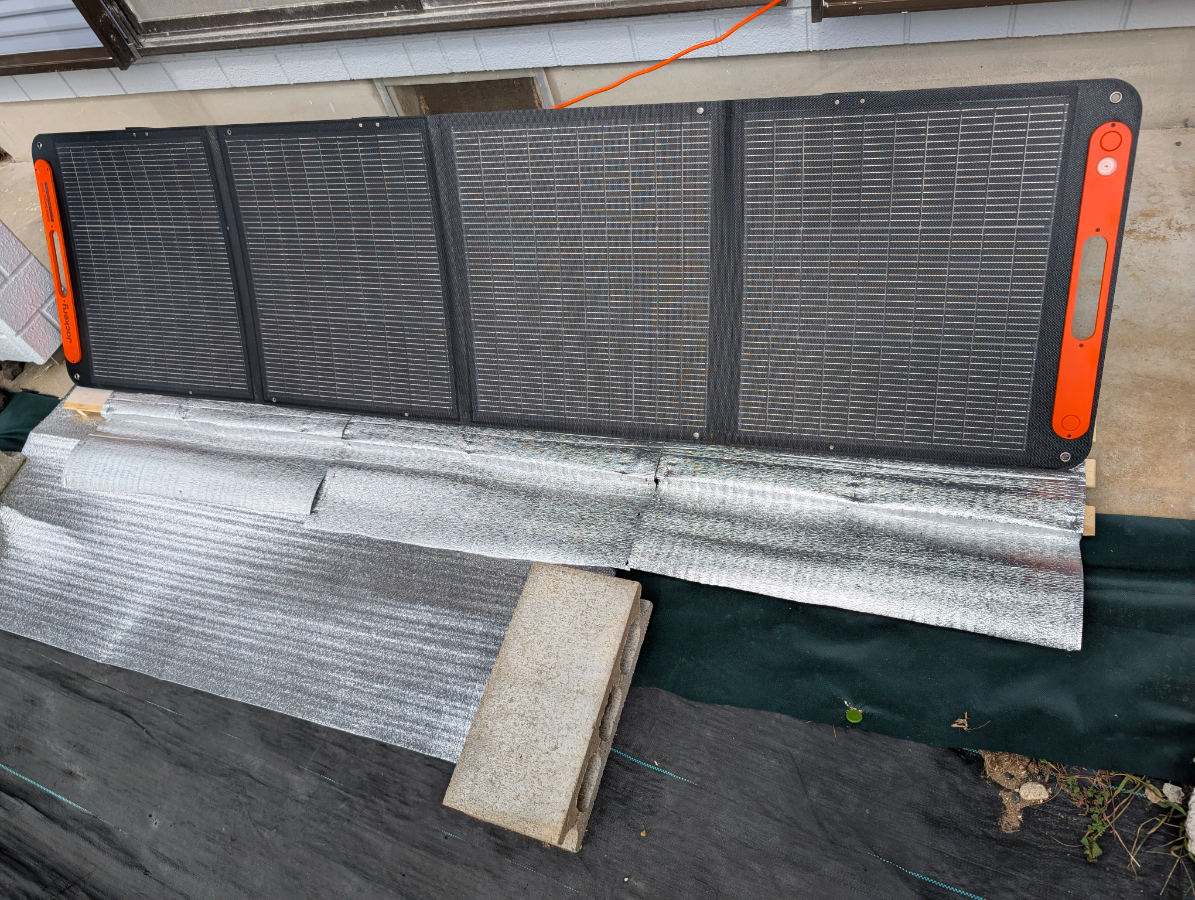 パネル面積は6,440cm2と比較的小さく、100Wしか電力を出力できませんでした。ポータブル電源に蓄電できるものの、災害時に1日で必要な電力を充電しきれなかったので、災害用としては若干発電量が少ない印象です。