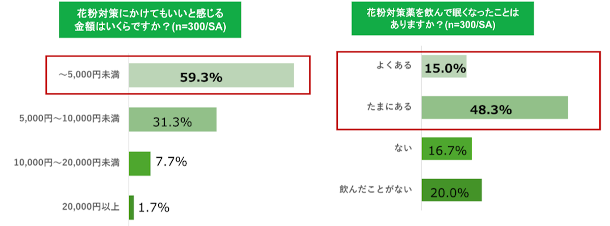 政府では花粉症対策薬などOTC類似薬の保険適用外を検討しており、今後値段が上がる可能性があります。一方調査では、花粉対策にかけてもいい金額として「~5,000円未満」と回答した人が58.3%と最多となり、高額な費用をかけたくない層が多いことがわかりました。