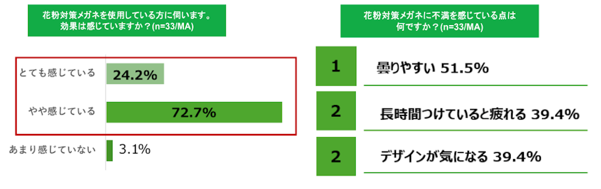 花粉対策メガネを使用している人の96.9%が「効果を感じている」と回答。一方不満点としては「曇りやすい」「長時間つけると疲れる」「デザインが気になる」などが挙げられており、自分に合った商品選びや正しい使い方が重要であることも明らかになりました。