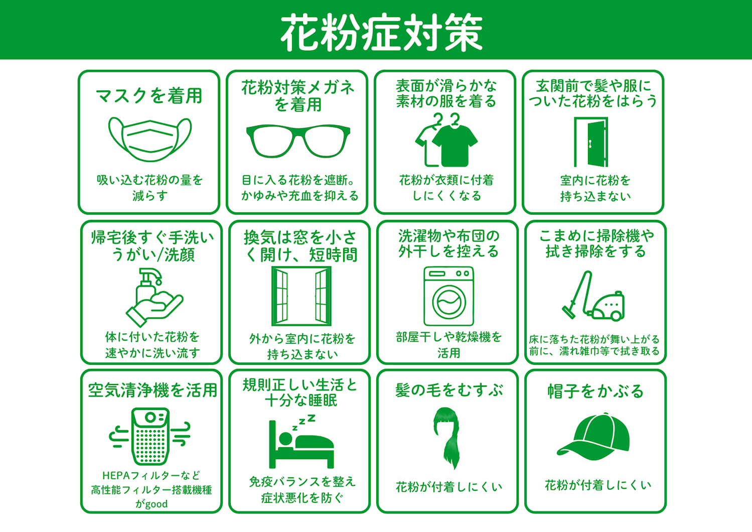 花粉対策は、ひとつの対策だけでなく複数を組み合わせることが重要です。以下のような対策を併用することで、より高い効果が期待できます。