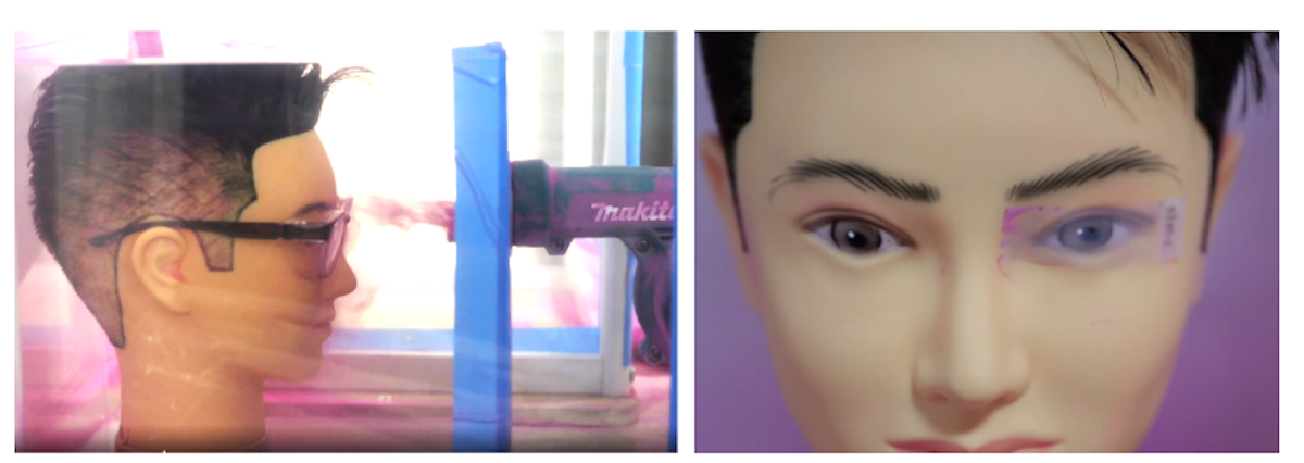 花粉対策メガネを装着したマネキンに熱湯の蒸気を当てて、メガネの曇りにくさを確認。メガネの曇りが少ないものほどおすすめとしておすすめ度をスコア化。