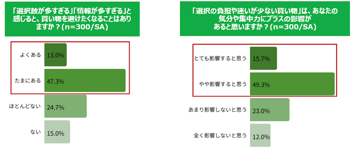 60.3%が「選択肢や情報が多すぎると買い物を避けたくなる」と回答。また65.0%が「選択の負担が少ない買い物は、気分や集中力にプラスの影響があると思う」と答えており、買い物における心理的負担軽減のニーズの高さが伺えます。