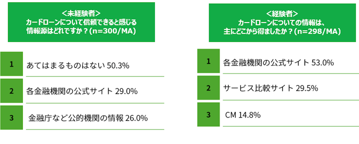 未経験者がカードローンについて信頼できると感じる情報源1位は「各金融機関の公式サイト(29.0%)」、2位「金融庁など公的機関の情報(26.0%)」、3位「サービス比較サイト(10.0%)」という順に。しかし最多は「あてはまるものはない(50.3%)」で、半数以上がカードローンに関する信頼できる情報源を見つけられていない実態が明らかになりました。一方経験者は「各金融機関の公式サイト(53.0%)」に次いで「サービス比較サイト(29.5%)」が2位という結果に。経験者の方が複数サービスの比較ニーズが高い可能性が伺えます。