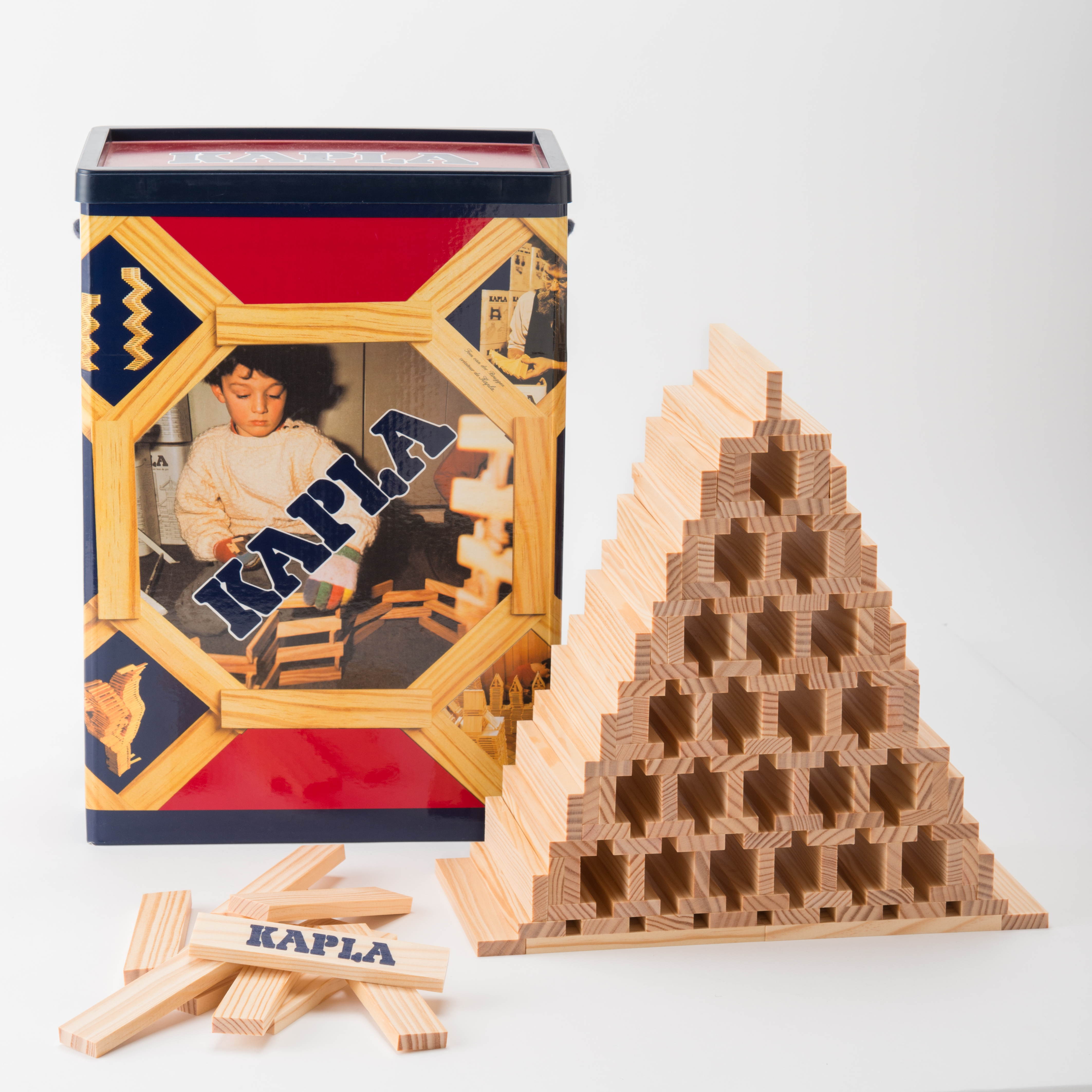 ブロックすべてが、同じ大きさ・同じ形であることが特徴。マツを材料に「三次元の黄金比」と呼ばれる比率で作られています。自然素材だから口に入れても安全。