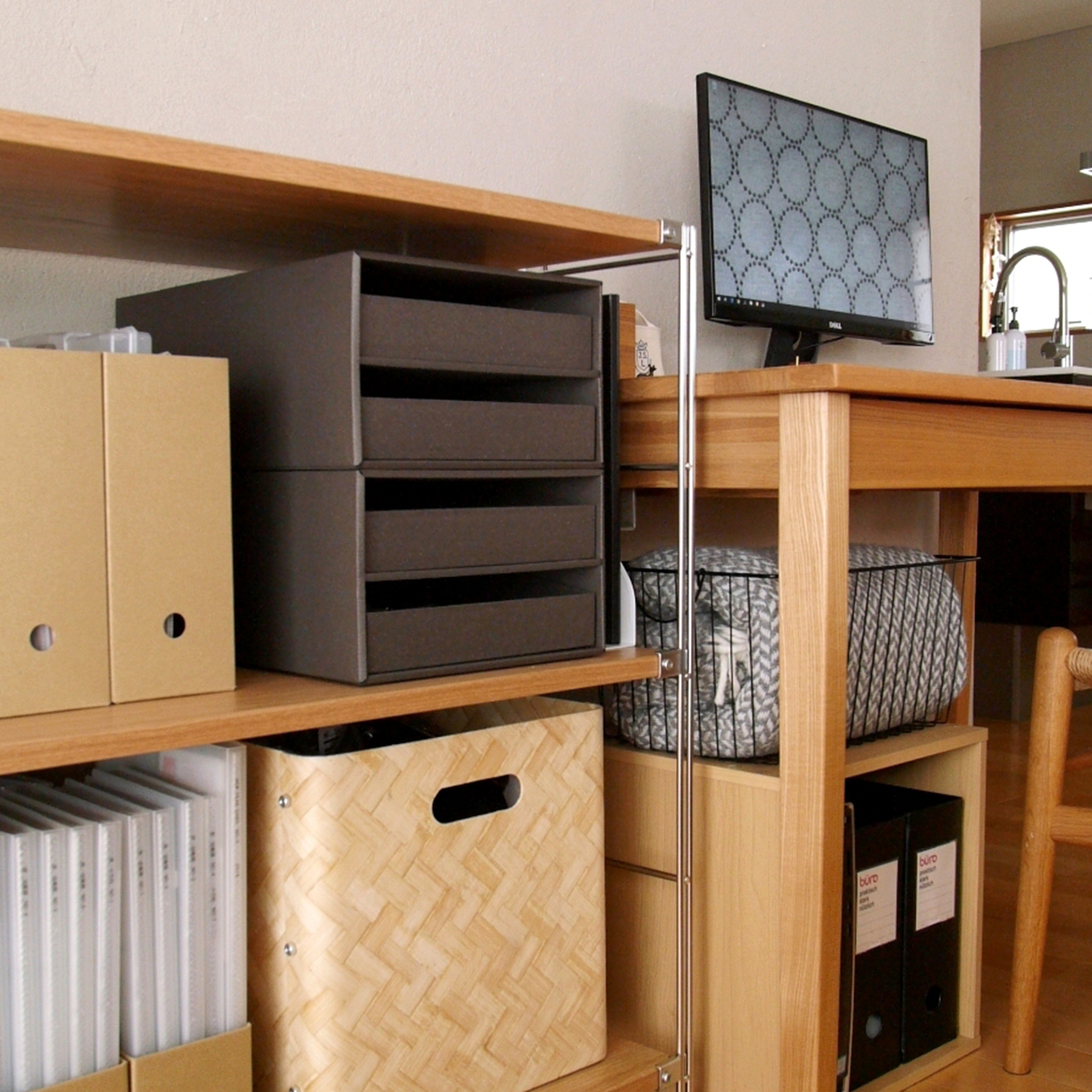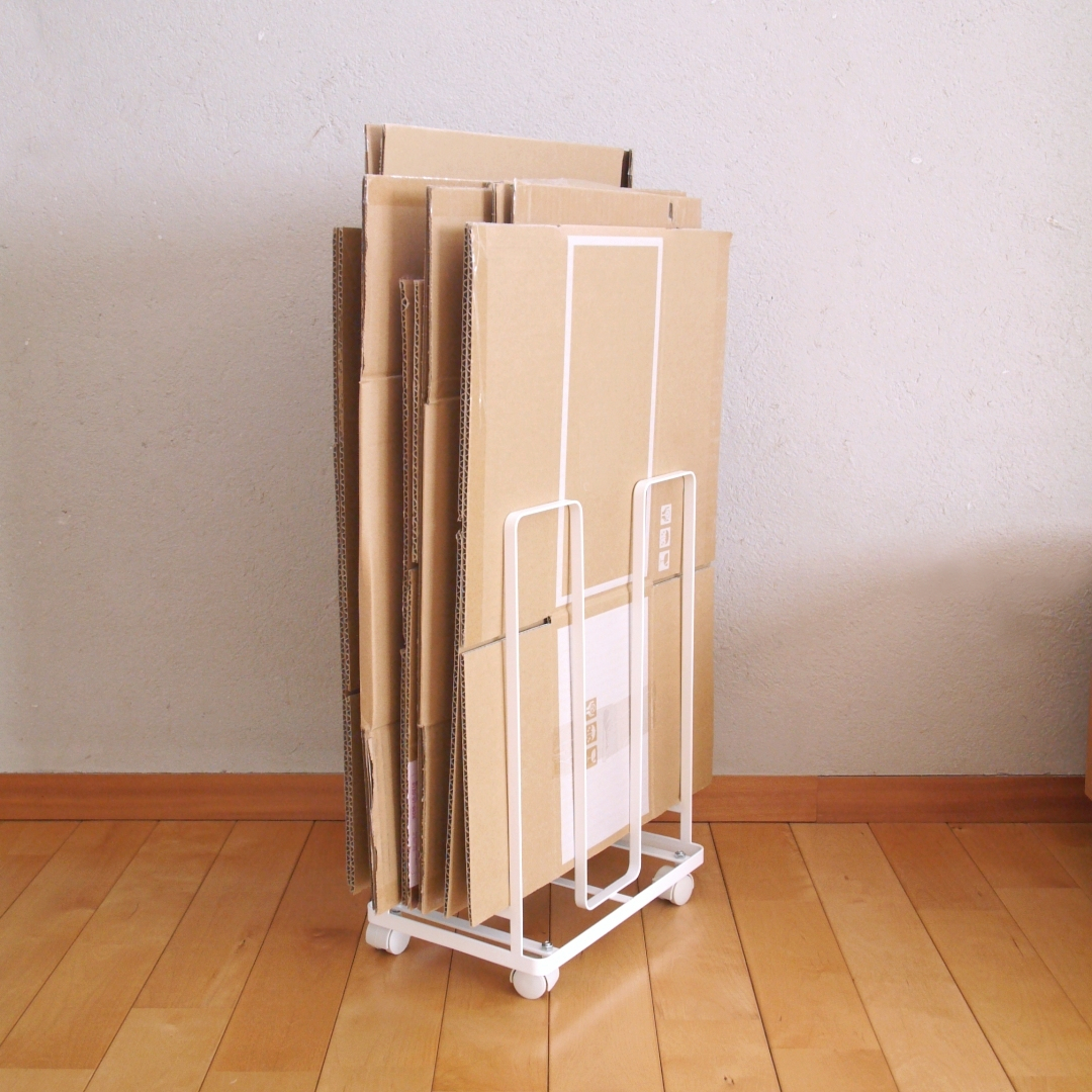 畳んだダンボールは立て掛けて保管しておくと、倒れてきたり広がったりとすこし面倒な存在でした。そんなかさばって場所をとるダンボールを、スッキリ収納できるダンボールストッカーです。