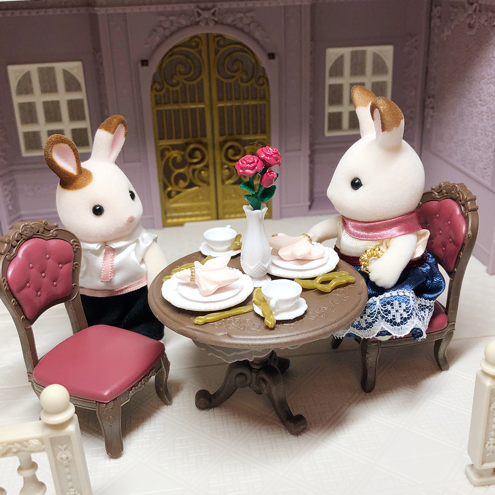 出典:amazon.co.jp出典:amazon.co.jpエポック街のダイニングテーブル TF-05664円さやぽんこちらは、グランドハウスにぴったりのおしゃれなダイニングテーブル。ショコラウサギのお姉さんのボーイフレンドのシナモンウサギのお兄さんとのステキなディナータイムや、仲良しのお姉さんたちとのティータイムにも使えます。ホテルのレストランにあるような高級感のあるデザインが素敵ですよね。付属の食器も今までのシルバニアファミリーの食器と違って、細かな装飾が施されています。シルバニアタウンシリーズの家具は、ショコラウサギのお姉さんのお友達で家具デザイナーのマシュマロネズミのお姉さんがデザインしているそうですよ。私はこのダイニングテーブルを複数購入して、街のすてきなレストランにも追加しています。…もっと見る