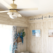 我が家が選んだホワイトカラーはエイジング加工が施されていて、味のある仕上がり。リビングの天井にこのシーリングファンが付いているだけで、海沿いのビーチハウスのようなテイストのお部屋に仕上がります。