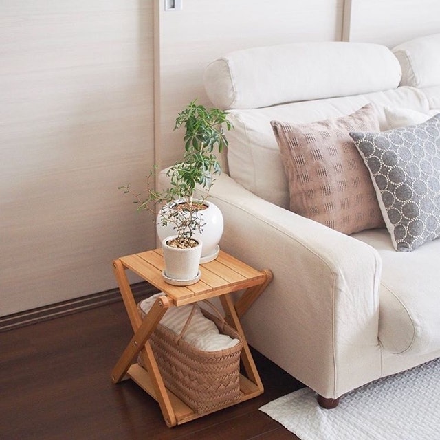 棚の片側の引っ掛けを外せば簡単に折りたためるので、使わないときはコンパクトに収納できます。我が家ではグリーンを置く台として使うほか、ソファ横のサイドテーブルとしても使っています。冬場は加湿器を置く台としても重宝です。
