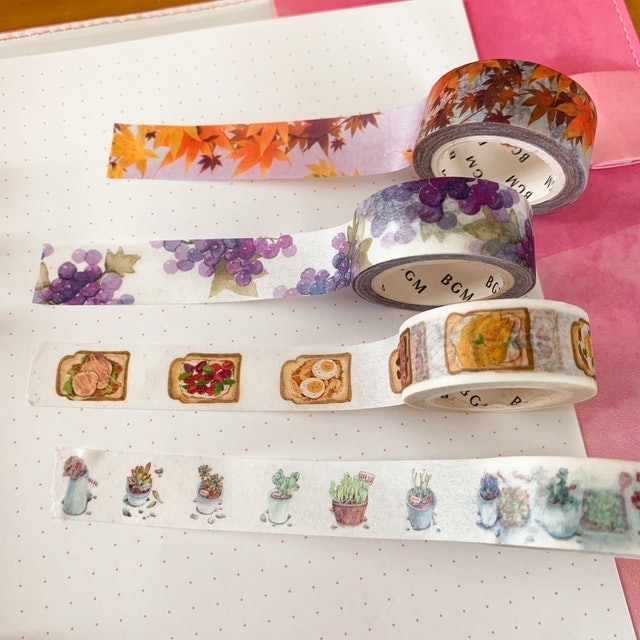 出典:item.rakuten.co.jp出典:item.rakuten.co.jp出典:item.rakuten.co.jp出典:item.rakuten.co.jpBGMマスキングテープ 15mm174円kumiお気に入りのBGMのマステ。いくつかサイズがありますが、これは幅が15mmの標準サイズです。淡い水彩画のような柄が特徴で、柄が独立しているものは、ひとつずつ切ってシールのように使えます。パン柄は女子に人気の柄。美味しそうなトーストが次々に出てくるマステは、マンスリー手帳にも収まる大きさなのでポイント使いにも便利です。葡萄のマステは、季節感溢れるマステシリーズのひとつ。とにかく色がキレイで、マステの中に収まりきらずにはみ出しそうに描かれています。他にも紅葉や桜、雪景色など、どこか和風の柄も多く落ち着いた雰囲気の大人のマステです。…もっと見る