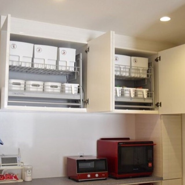 こんな吊り戸棚ボックス探してた!キッチン雑貨やお弁当箱などを収納するのにちょうどいいサイズです◎前面に持ち手が付いているので、高い場所に置いても引き出しやすい!あまり身長が高くない私でも、簡単に引き出すことが出来ています。