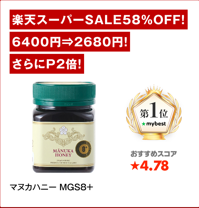 マリリニュージーランドマヌカハニー MGS8+2,680円favlistおトク発信部マヌカハニーのおすすめ人気ランキング1位おすすめスコア ★4.78食べやすいマヌカハニーならコレ!まろやかで甘く、価格も手頃
