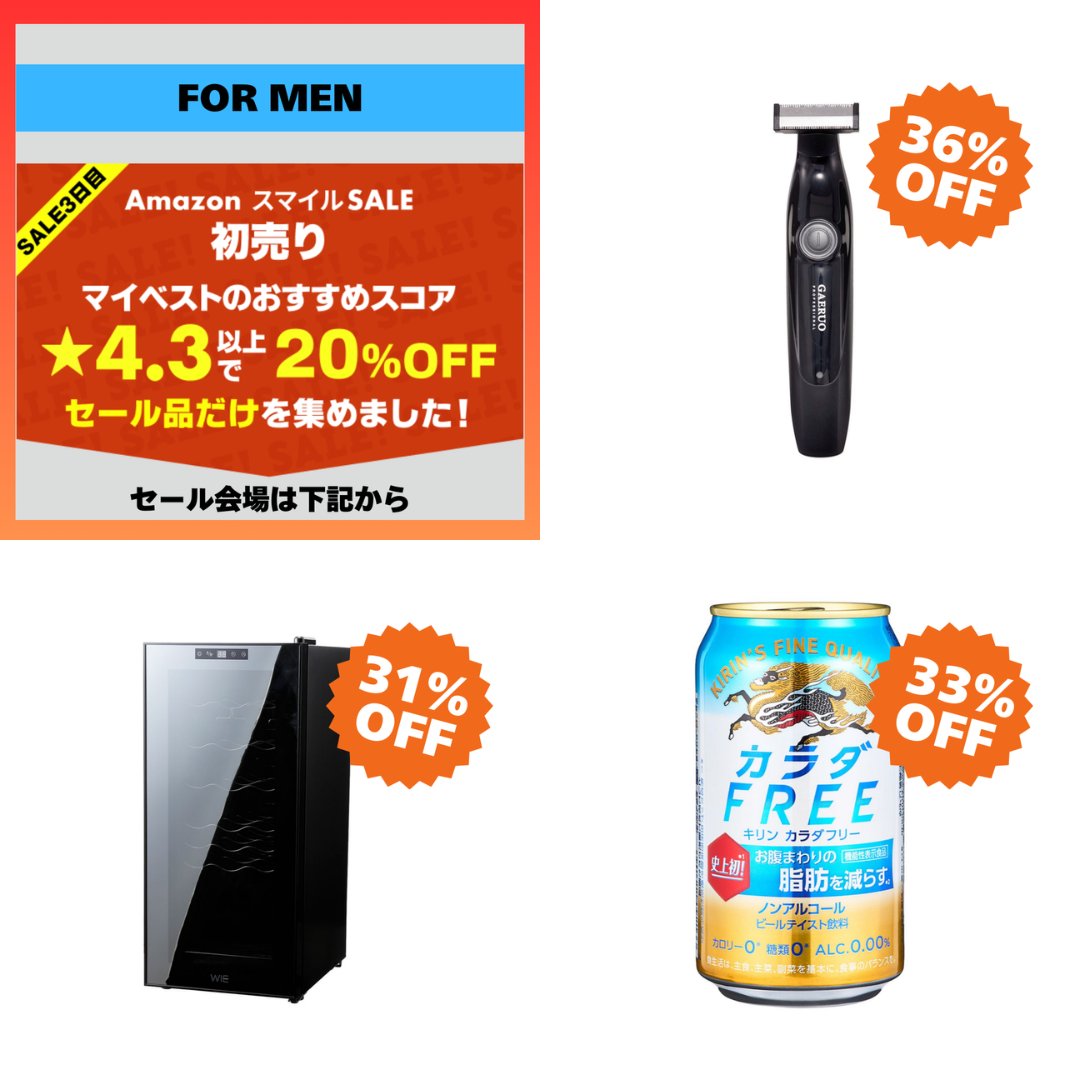 おすすめスコア★4.3以上でさらに20%OFFのセール品【男性向け】favlistおトク発信部1枚目・ボディシェーバー(GAERUO)2799円・ワインセラー(WIE)29680円・カラダFREE(キリンホールディングス)2278円2枚目・トラックボールマウス(Ewin)3180円・FOSMET QS40(FOSMET)7415円・ハイ&ローコットワイド(キャンパルジャパン)18023円・Fire HD 10 タブレット(Amazon)14980円…もっと見る