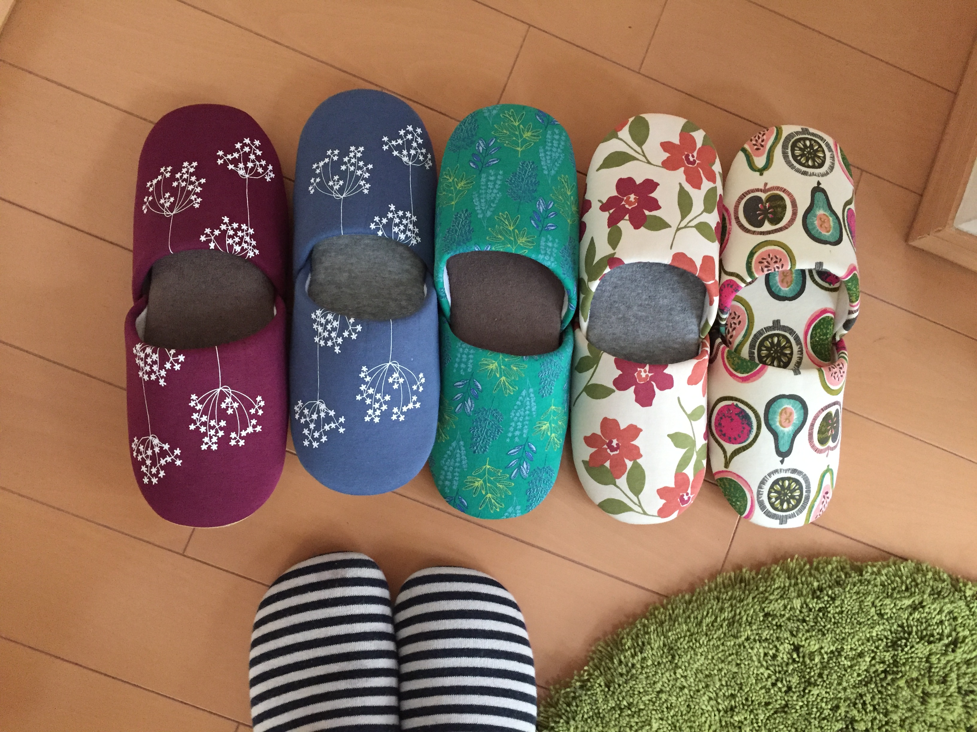 我が家で重宝しているのが、こちらのシリーズ。ベルメゾンの模様ありスリッパ。色別で5つほど「お客様用」にしています。玄関先で好きな色、好きな模様を、その時の気分で選んでもらっています。お客様には「嬉しい」「可愛い」と喜んでいただき、好評です。