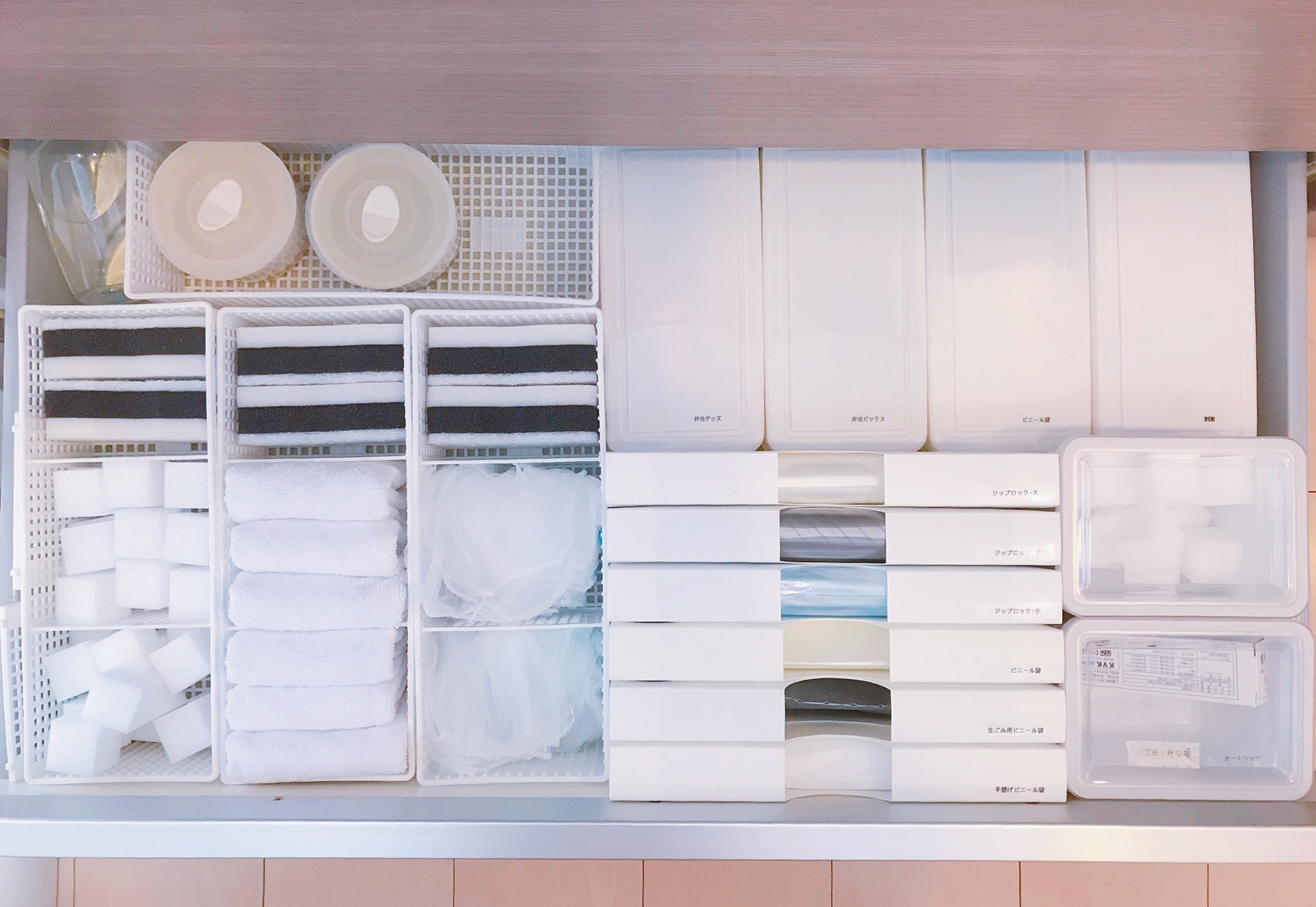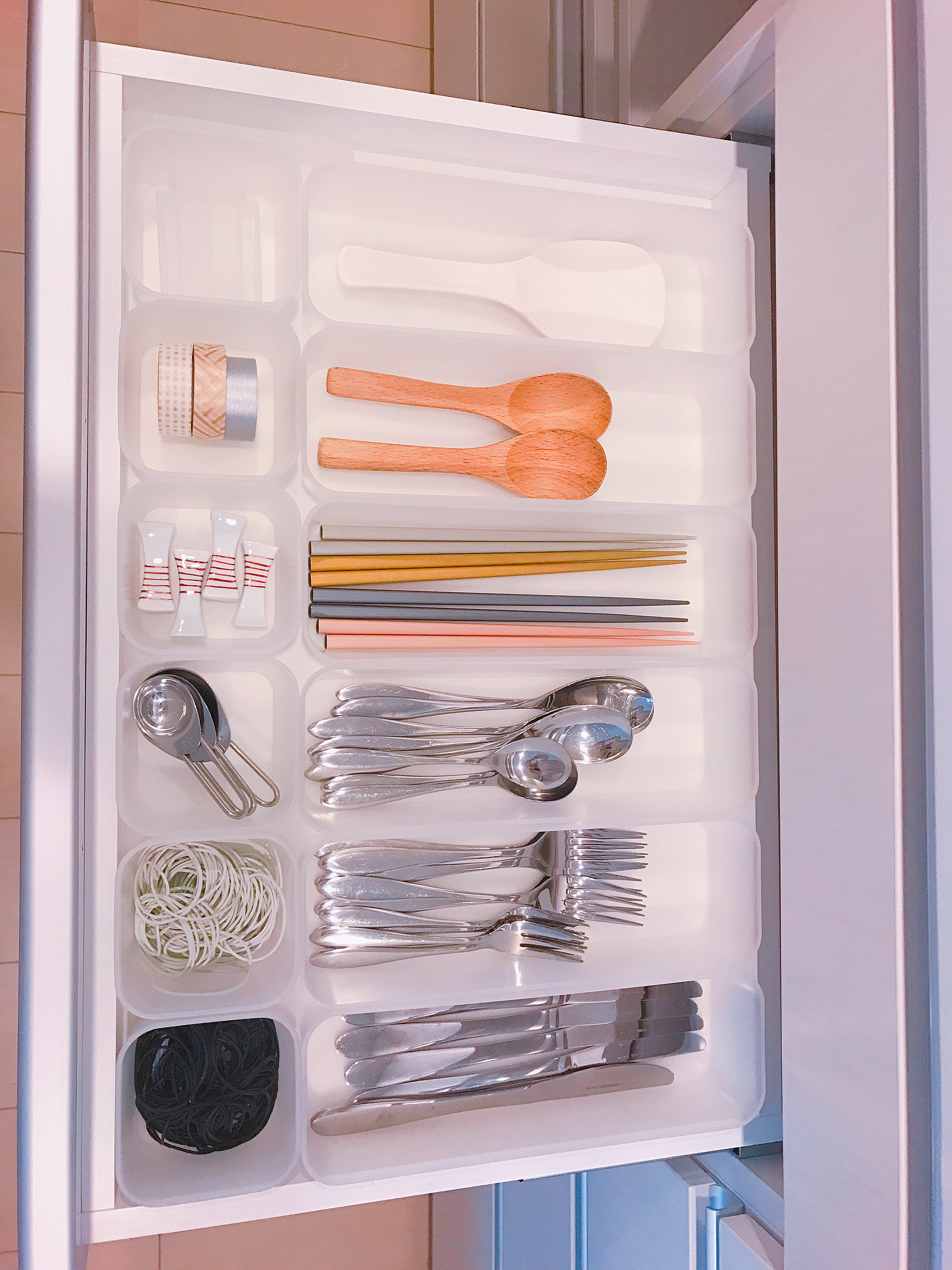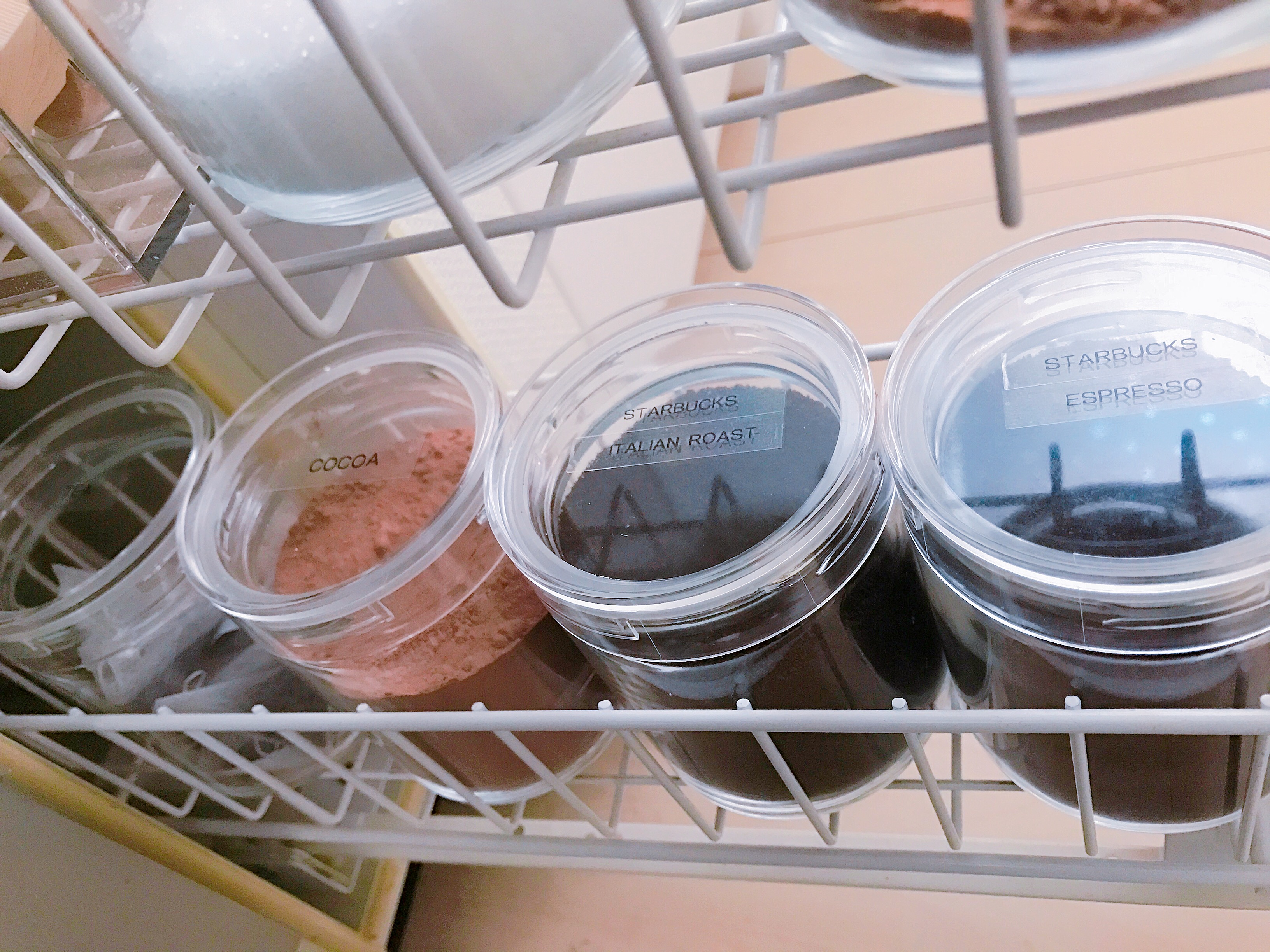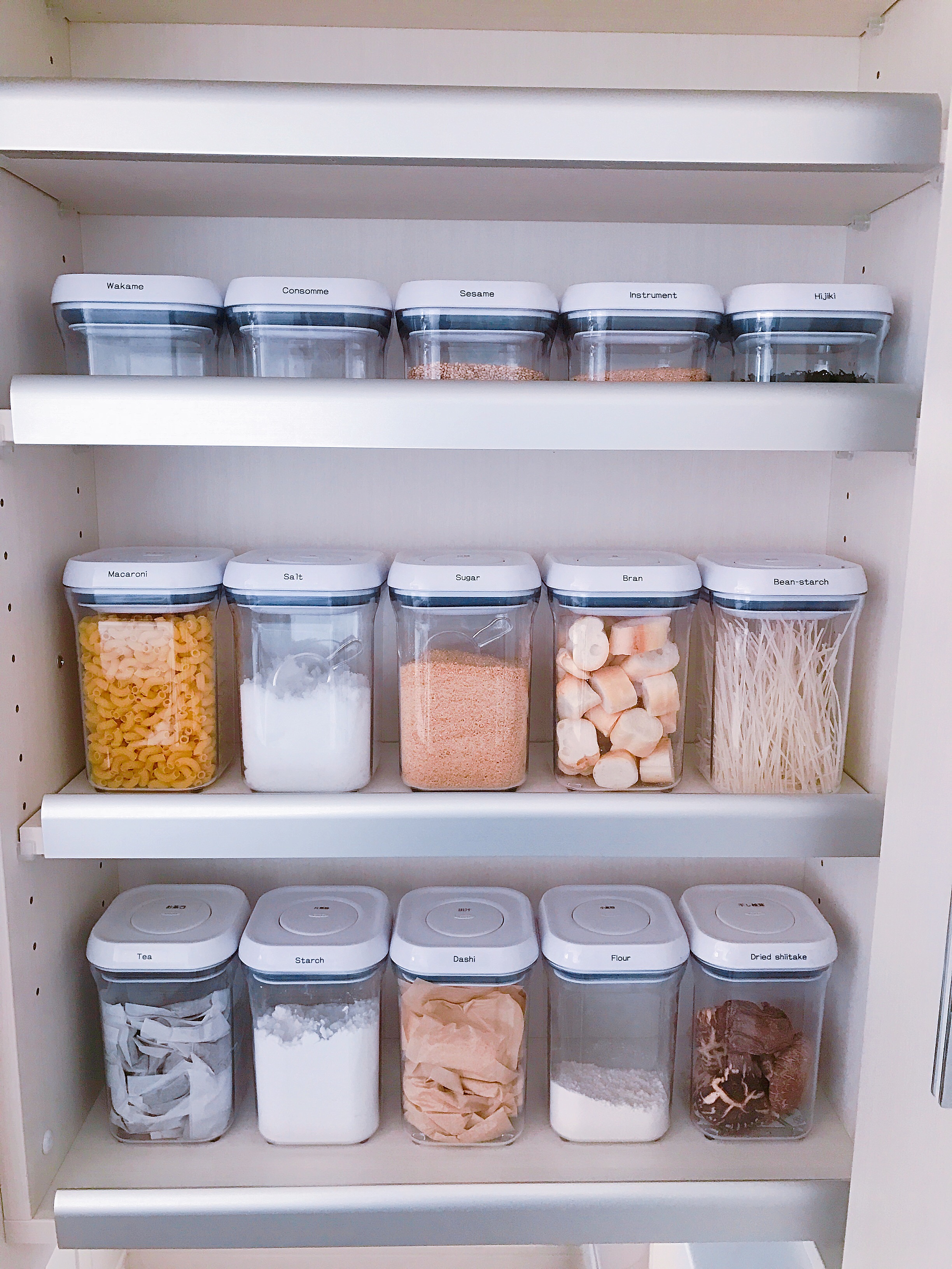 いろんなサイズと形が揃うオクソーのコンテナ。わが家ではフタのサイズが11×11cmの正方形の「スモールスクエア」タイプ2種類を、入れるものによって分けて使用しています。フタの中心についているボタンを押すだけのワンタッチ操作で開封・密封ができるので、急いでいるときでも片手で楽々!時短にもなります。