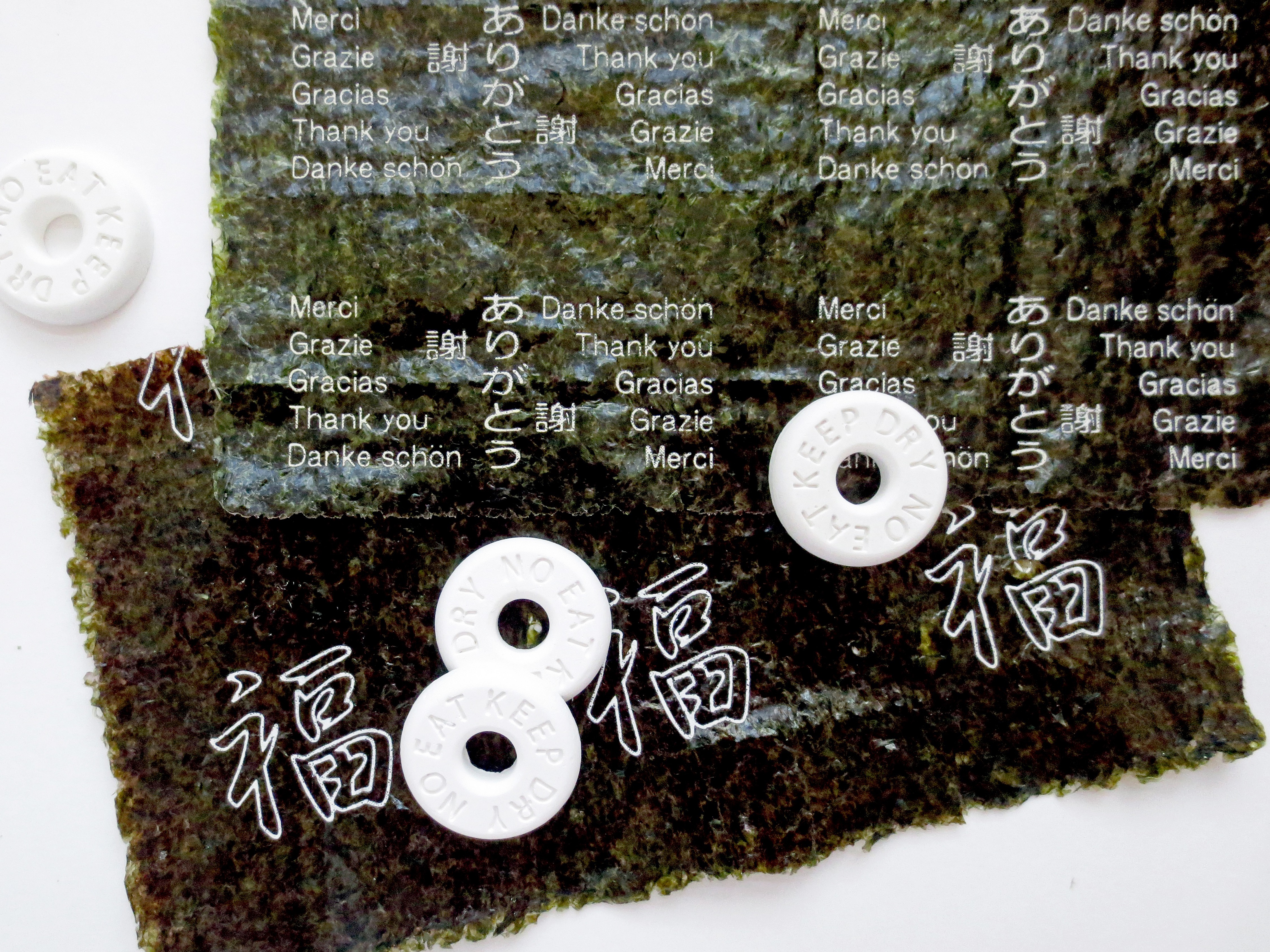 出典:amazon.co.jpイトウ珪藻土 マルチブロック巻真美海苔の乾燥を保つのには、持ち運びやすい乾燥タブレットがおすすめです。珪藻土の乾燥剤は貝殻やスティックなど、いろいろな形が出るたびに買っていますが、最近はこれがお気に入りです。海苔については光と湿気を遮断するのが秘訣なので、自宅ではさらに、透けないアルミの密封ビニールに入れて冷蔵庫保管しています。ちなみに写真の文字プリントの海苔は、恵方巻の季節や国際交流の巻き寿司イベントでよく使っているものです。