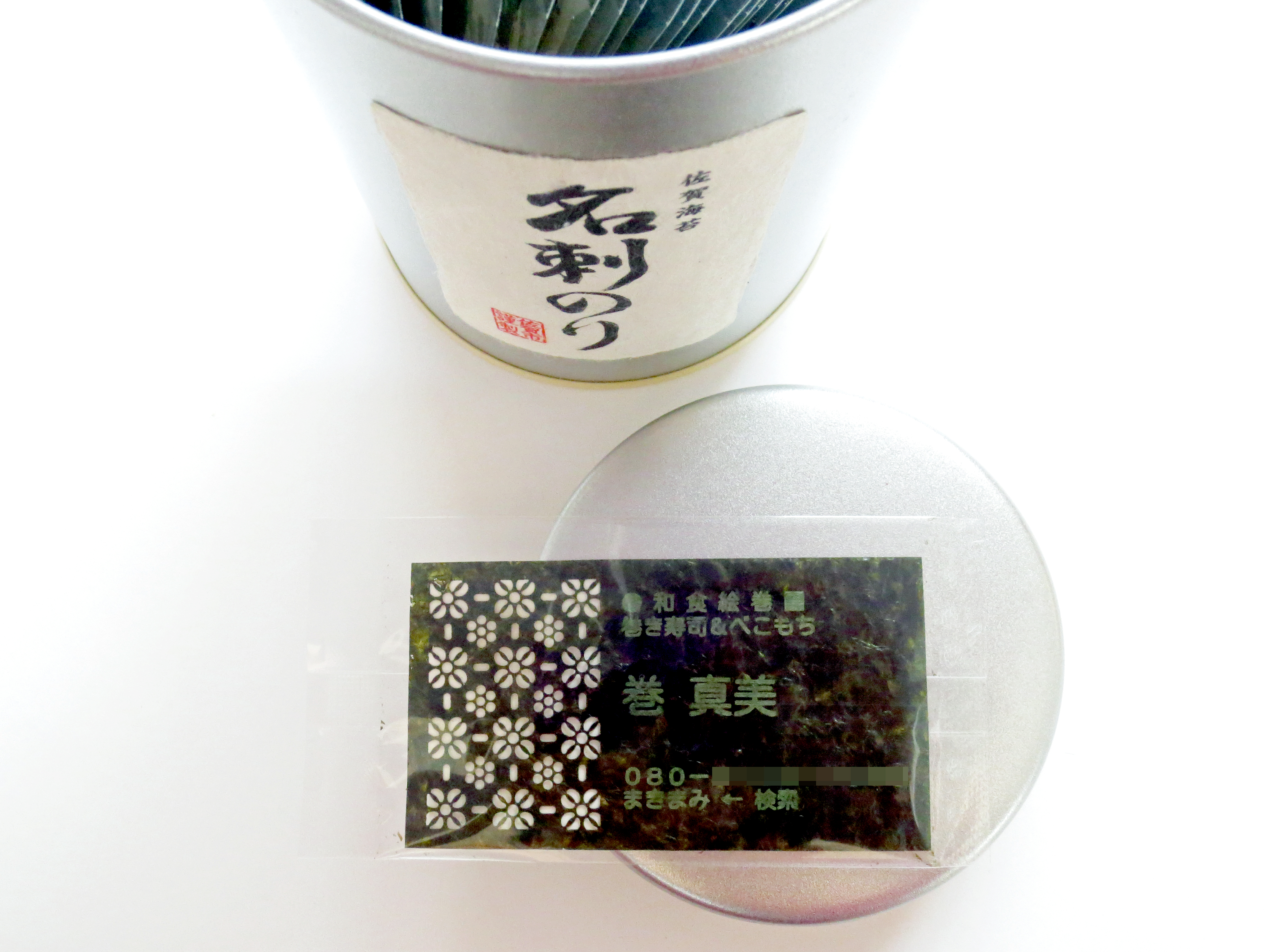 名刺のりプロジェクト佐賀海苔 名刺のり12,000円巻真美海苔でできている「名刺のり」。飾り巻き寿司インストラクターとして、ここぞ!というときはこの名刺でご挨拶させていただきます。もちろん食べられます。ちゃんとビニール個包装されているので持ち運びも受け渡しも安心。海苔の賞味期間は半年~一年です。飲食業のお仕事の人、お寿司やお握りなどが好きな人に、ぜひご活用いただきたい珍しい名刺です。ただしお相手が完食すると連絡先もなくなってしまうので、紙の名刺とご一緒にお渡しすることを推奨します。ちなみに飾り巻き寿司用の海苔は、高級で厚すぎても、安価で薄くて緑色に透けても、海苔巻きの見栄えに影響します。実は中級のほどほどの厚みと黒さがちょうどよく、おすすめだったりいたします。