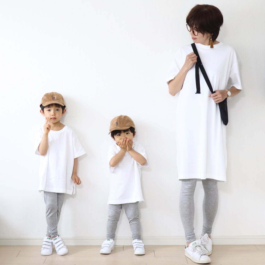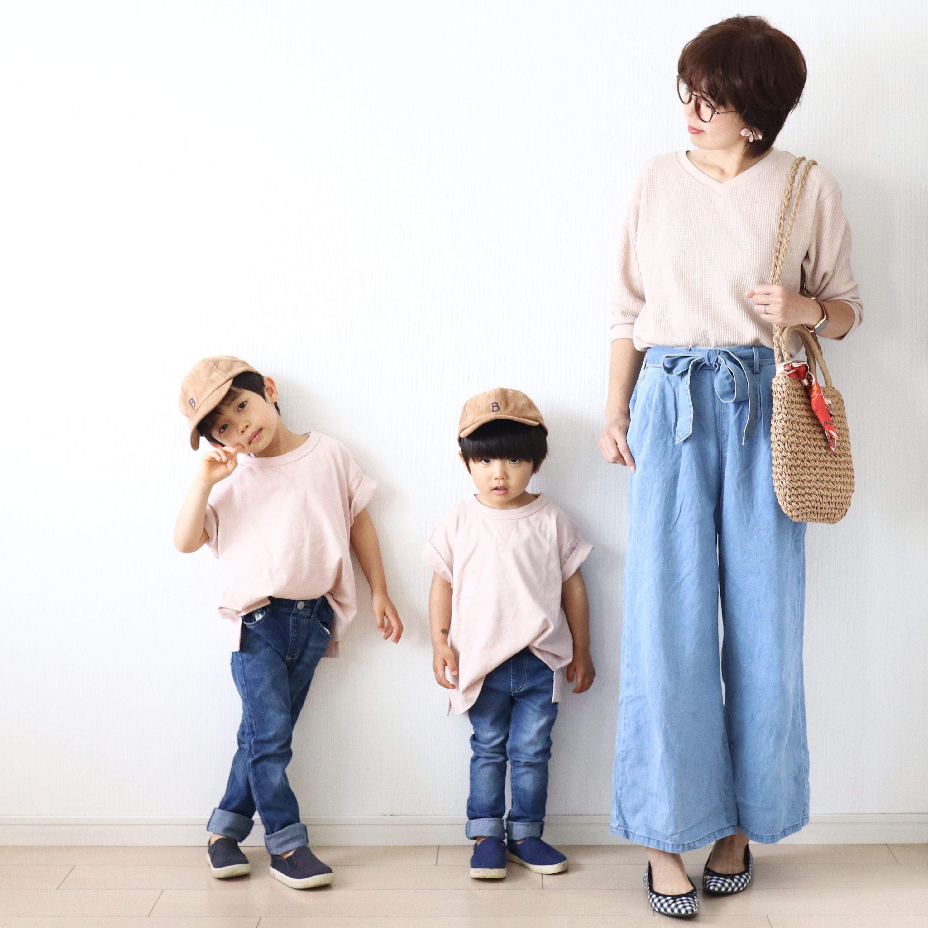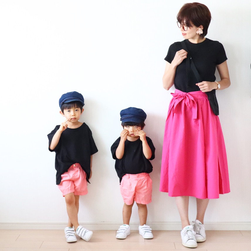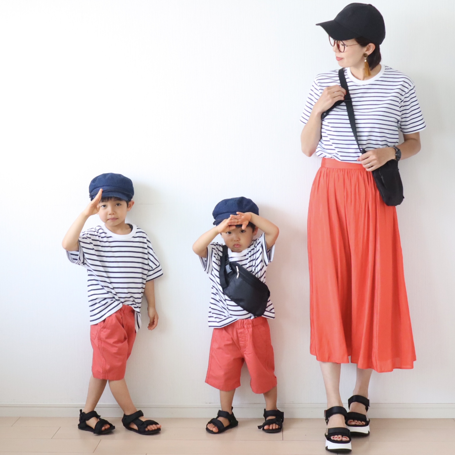 西松屋のハーフパンツは、なんと1000円以下(*^_^*)!お揃いのロゴTは、ZARAの人気アイテム。ママもKIDS商品の大きめサイズを着ています。