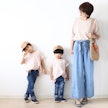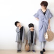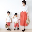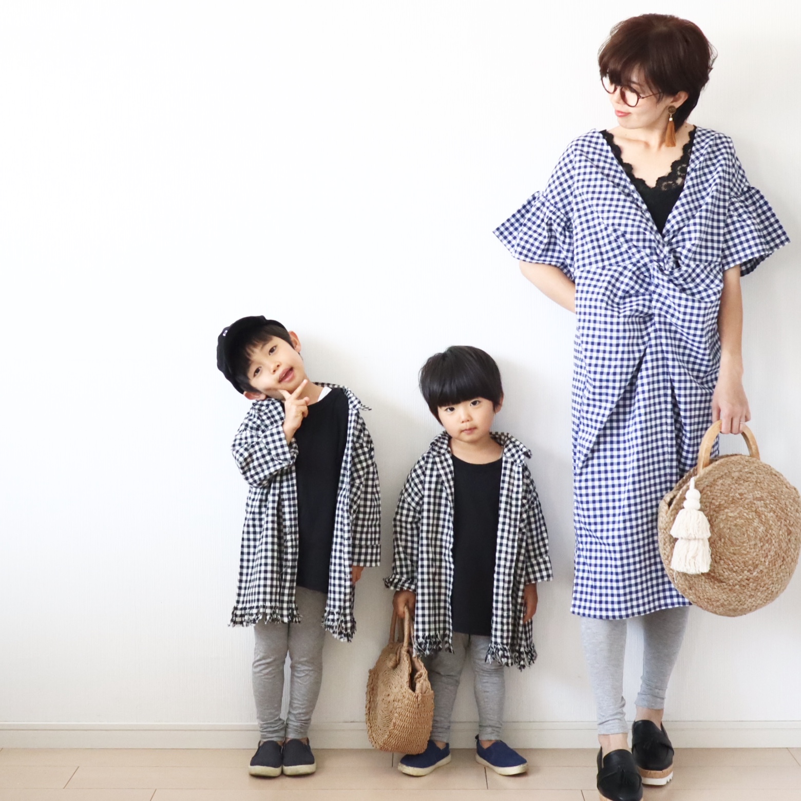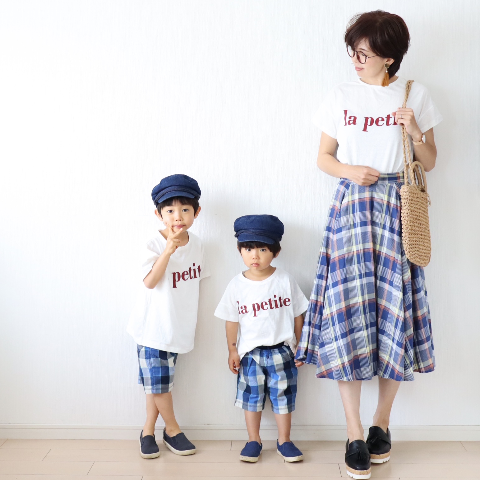 さわやかなブルーのチェックとお揃いのロゴTでリンクコーデ♡ママのチェックスカートに合わせて、子どもたちはチェック柄のハーフパンツで合わせました。甘いイメージのチェック柄も、ブルー系を選べば男の子でも女の子でも取り入れやすいです。