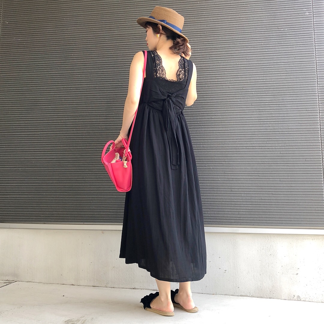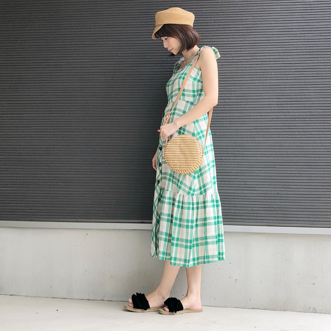 こちらのワンピースは、肩ひもが結ぶタイプなので、ワンピース丈の長さを微調整することも可能。夏らしい緑のチェック柄もかわいらしい印象ですよね。透け感も気ならないので、これ1枚でスタイリングが完成します。