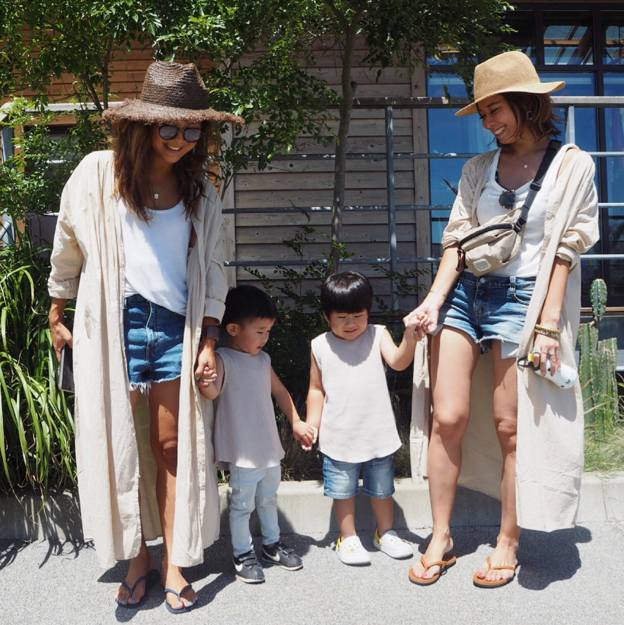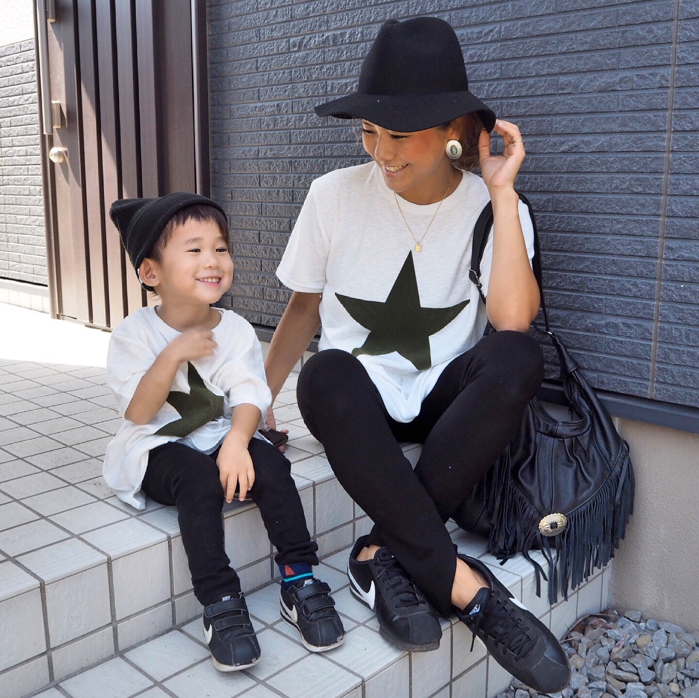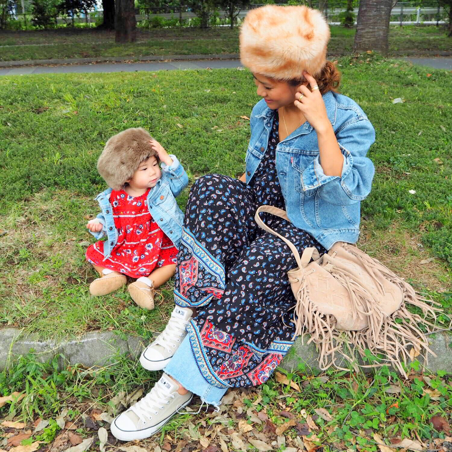 親子で柄物ワンピを着れば、それだけで親子リンクコーデが完成します。さらに小物やGジャンを使ってリンク感アップ!