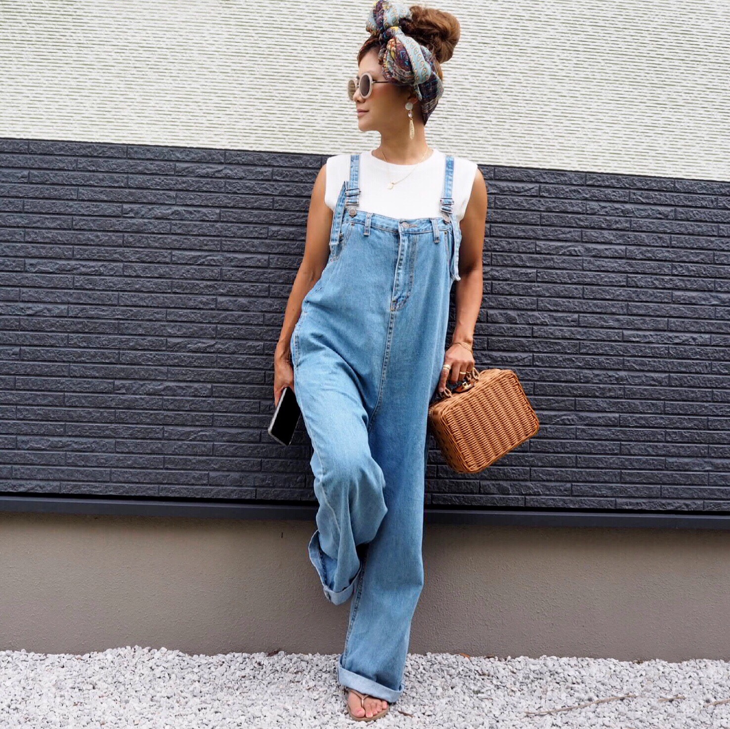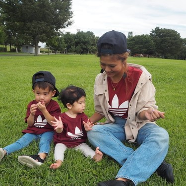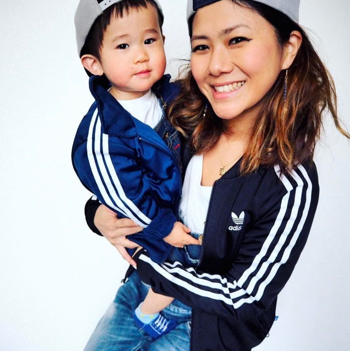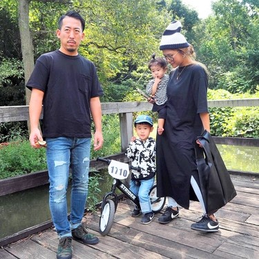 親子で柄物ワンピを着れば、それだけで親子リンクコーデが完成します。さらに小物やGジャンを使ってリンク感アップ!