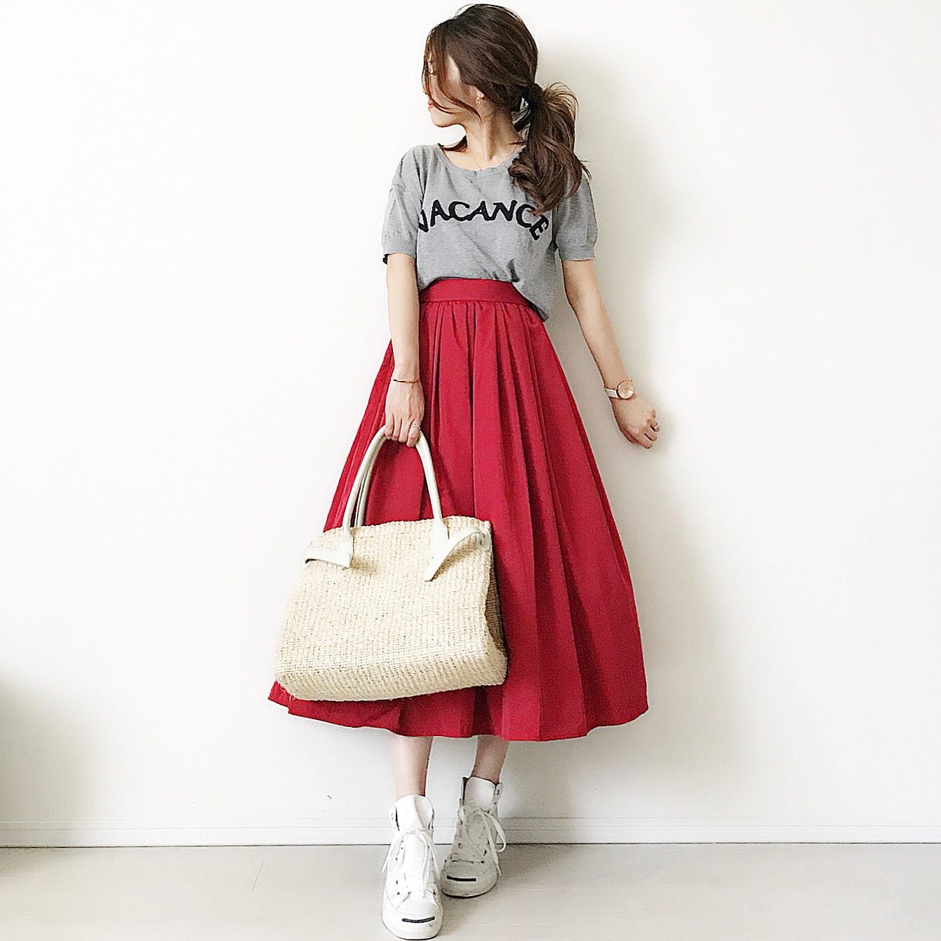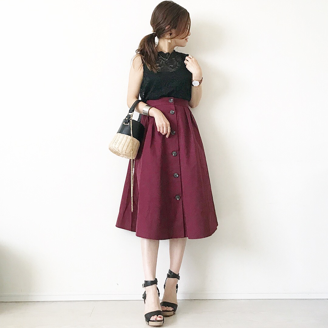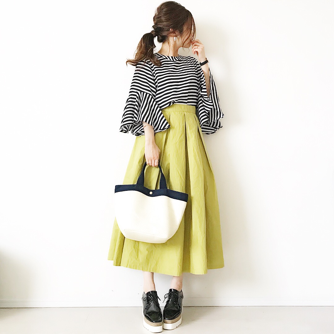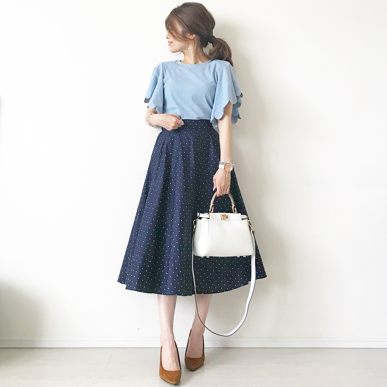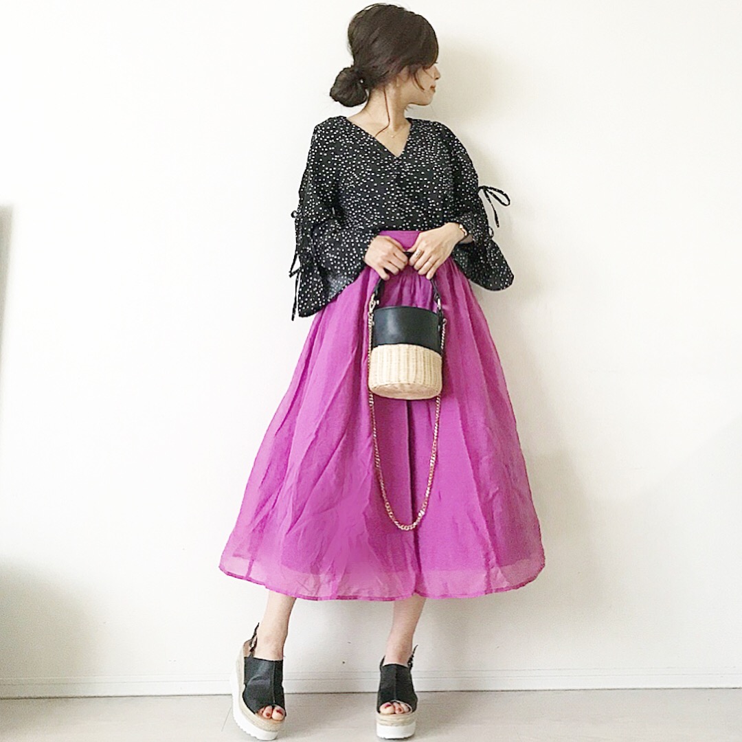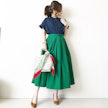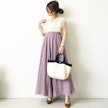 私はくすみカラー同士を組み合わせて、ロマンチックな雰囲気で着るのが好きです。座り皺も目立ちにくく、長距離異動の旅行など休日コーデにびったりです。
