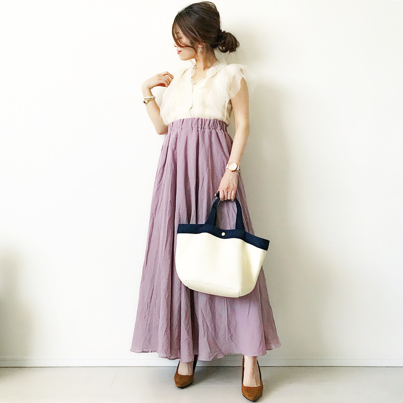 くすみカラーは大人でも挑戦しやすいカラー。このラベンダー色は上品な印象です。小物はシルバーやホワイト合わせがおすすめ。